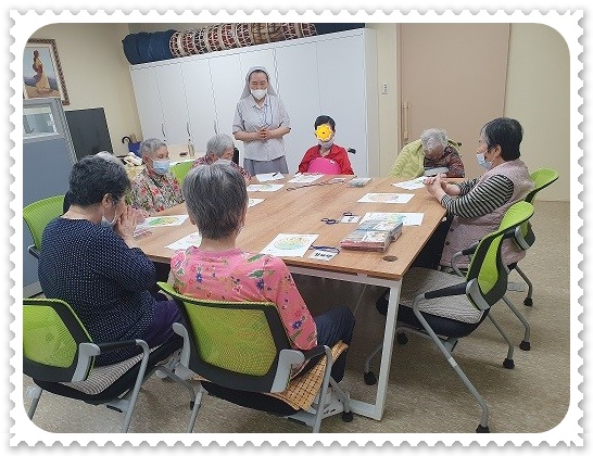 *오늘 수업은 살아오면서 자신의 마음에 늘 자리하고 있는 사람을 떠 올리며, 사랑받았고 사랑해 주었던 아름다운 관계를 기억하며 만다라를 완성하는 작업을 하였다. 참석한 아홉 분의 어르신들이 대체적으로 스스로 하는 것이 어렵고 표현이 잘되지 않아서 선생님의 도움이 필요한 상황이었다. 몇 분의 어르신은 지난 주 보다는 좀 더 자연스럽게 만다라에 색칠을 하는 모습도 보였다. 다 완성된 행복한 만남의 만다라를 보면서 자신이 마음에 남아있는 사람의 이야기를 나누는 어르신도 있었고 선생님의 도움으로 색칠만 하신 어르신도 있었다. 오늘 완성된 만다라를 보면서 “사랑해요.”라는 노래를 들으며 손동작을 하면서 가벼운 마음으로 마쳤다.
