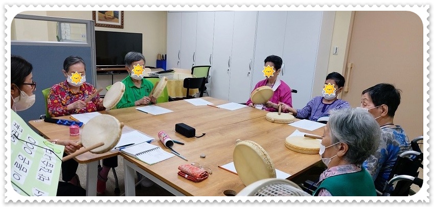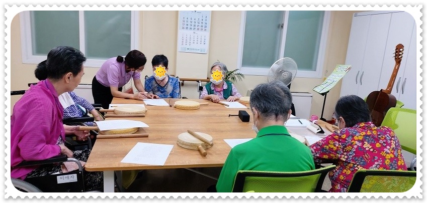 오늘도 어르신들과 반갑게 인사를 나누고 인사 노래를 하며 자신의 이름을 소개하고 활동을 시작하였고 신체활동을 통해서 몸의 긴장감을 풀고 근육을 이완하실 수 있게 하여 활동을 준비하실 수 있게 함. 먼저 오늘 준비한 ‘님과 함께’ 노래를 들려드리고 노래에 대한 기억들을 나눌 수 있게 하였는데 어르신들이 거의 다 기억하시는 모습을 보여 주셨고 노래를 불렀던 가수에 대해서도 기억들을 나누어 주시는 모습을 보여 주심. 다음으로 노래를 따라 부르실 수 있게 하였고 노래를 박자에 맞춰서 부르실 수 있게 소고와 함께 부르게 하였는데 치료사가 지시하는 박자에 맞춰서 노래해 주시는 모습을 보이심. 두 분씩 짝을 지어서 노래를 부르실 수 있게 하였는데 이경자 어르신과 이필안 어르신이 함께 불러 주셨고, 이정애 어르신과 구정자 어르신이 함께 불러 주셨고, 이애자 어르신과 최옥신어르신이 함께 노래를 부르실 수 있게 하였는데 최옥신 어르신이 노래를 안 부르셔서 소고를 치실 수 있게 하자 이애자 어르신이 부르는 노래에 맞춰서 소고를 쳐 주시는 모습을 보이심. 다음으로 노래의 가사에 새로운 가사를 만들어 보는 활동을 하였는데 연필을 잡고 쓰는 것을 힘들어 하시는 어르신들은 치료사의 도움을 받으시며 가사 만들기에 참여해 주시는 모습을 보이심, 자신이 만든 가사를 노래 멜로디에 맞춰서 불러 보며 소개하는 활동을 하였고 수줍어하시는 반응을 보이셨으나 모두 발표해 주시는 모습을 보이셨고 시간이 되어 마침 노래를 하며 활동을 정리함. 익숙한 가요를 함께 부르며 옛 기억들을 떠올리는 시간을 갖을 수 있었고, 노래의 가사를 만들어 보는 활동을 통해서 자신의 생각을 표현하여 만든 가사로 노래를 불러 보며 자기 효능감과 성취감을 느끼며 정서적인 활기를 경험할 수 있었던 것으로 평가됨.