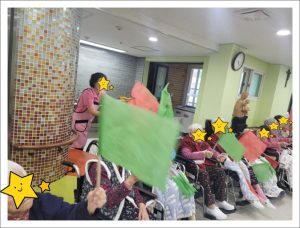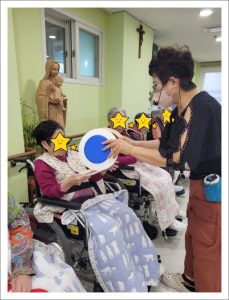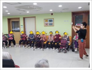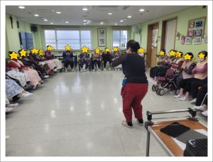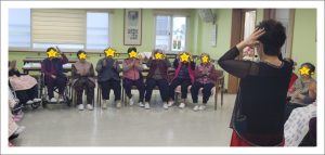 웃으며 활동하며 공부도 하는 웃음레크레이션입니다. 신체운동을 하면서 우리몸의 각 신체부위에 지역이름을 붙여드리고 그 지역에 해당하는 색깔을 연결하여 머리 !!! 하면 평양!!!… 평양하면 빨강 !!!… 이렇게 한꺼번에 여러가지를 연결하여 외우고 표현하는 활동을 하셨습니다. 복잡하지만 어르신들 사이에 서로 선의의 경쟁을 하시느라 몸과 목소리가 점점 더 커지며 열정적으로 하는 활동입니다. 아직 겨울인데 벌써 땀을 흘리시면 여름에는 얼마나 열기가 더하실 지 기대되는 시간이었습니다.