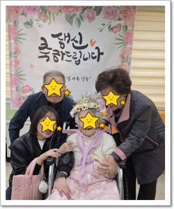 모든 행사가 마무리 된 후 생신을 맞이하신 어르신들의 가족들과 기념 촬영을 하셨고 곧 점심 식사를 하셨습니다.
