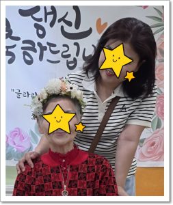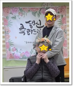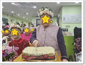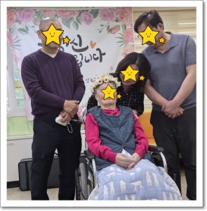 보슬보슬 마른 땅을 적셔주는 봄비가 내리는 토요일에 우리 어르신들의 5월 생신잔치를 해 드렸습니다. 다섯 분의 어르신께서 단장하고 행사장에 나오셨습니다. . 케익의 촛불을 끌 때 소원을 빌고 끄셨습니다.  우리 모두 건강하고 우리 딸 잘 되기를 바라고 모든 사람들 다 건강하기를 바라셨고 여기 선생님들 모두 감사하다는 말씀까지 챙겨서 인사를 해 주셔서 박수갈채를 받으셨습니다. 1부행사에 이어 라르고 공연단의 공연이 있었고 어르신들께서 장구 공연과 섹스폰연주등 다양한 공연을 관람 하시며 모두 즐거운 시간을 가지셨습니다. 신 나는 음악이 흘러 나오니 흥에 겨운 어르신들께서 앉아서 어깨춤을 추시다가 드디어 일어나서 춤을 추시고 무대로 나오셔서 진행자와 손을 잡고 빙글빙글 춤을 추셨습니다. 오늘도 여러 가족분들께서 생신잔치에 함께 해 주셔서 더 풍성하고 흥겨운 생신잔치가 되었습니다. 생신을 맞이하신 어르신들 진심으로 축하드립니다.