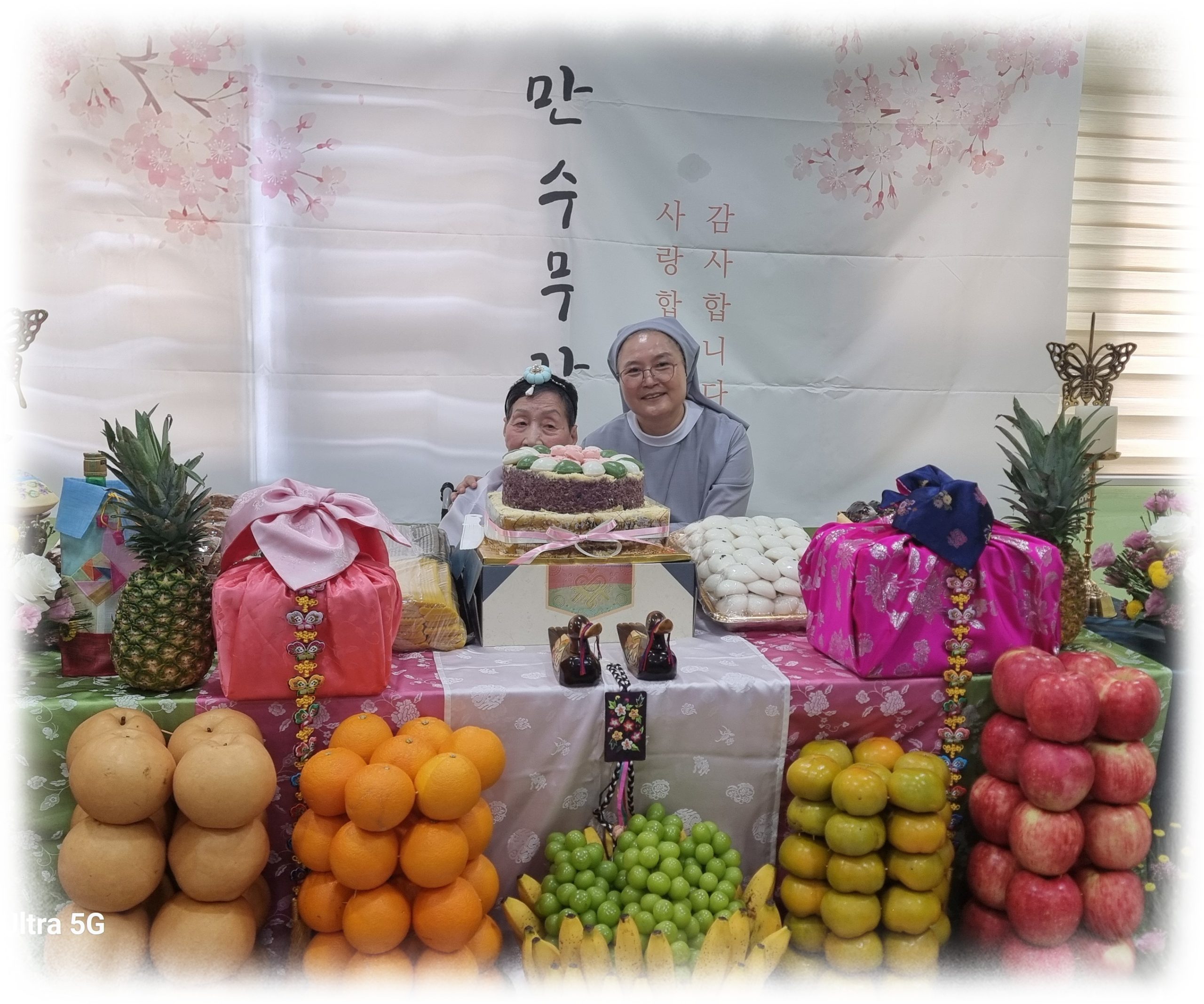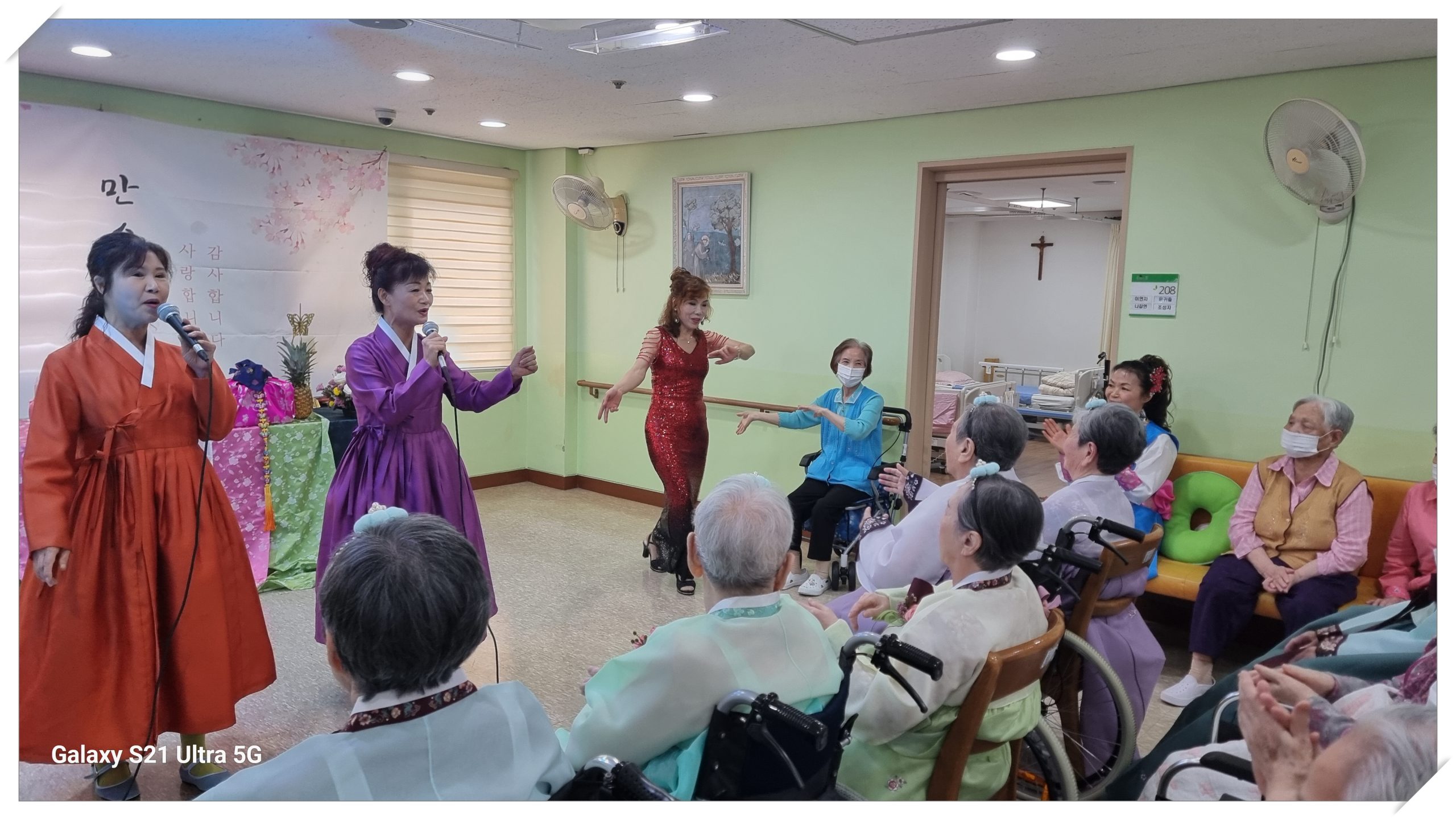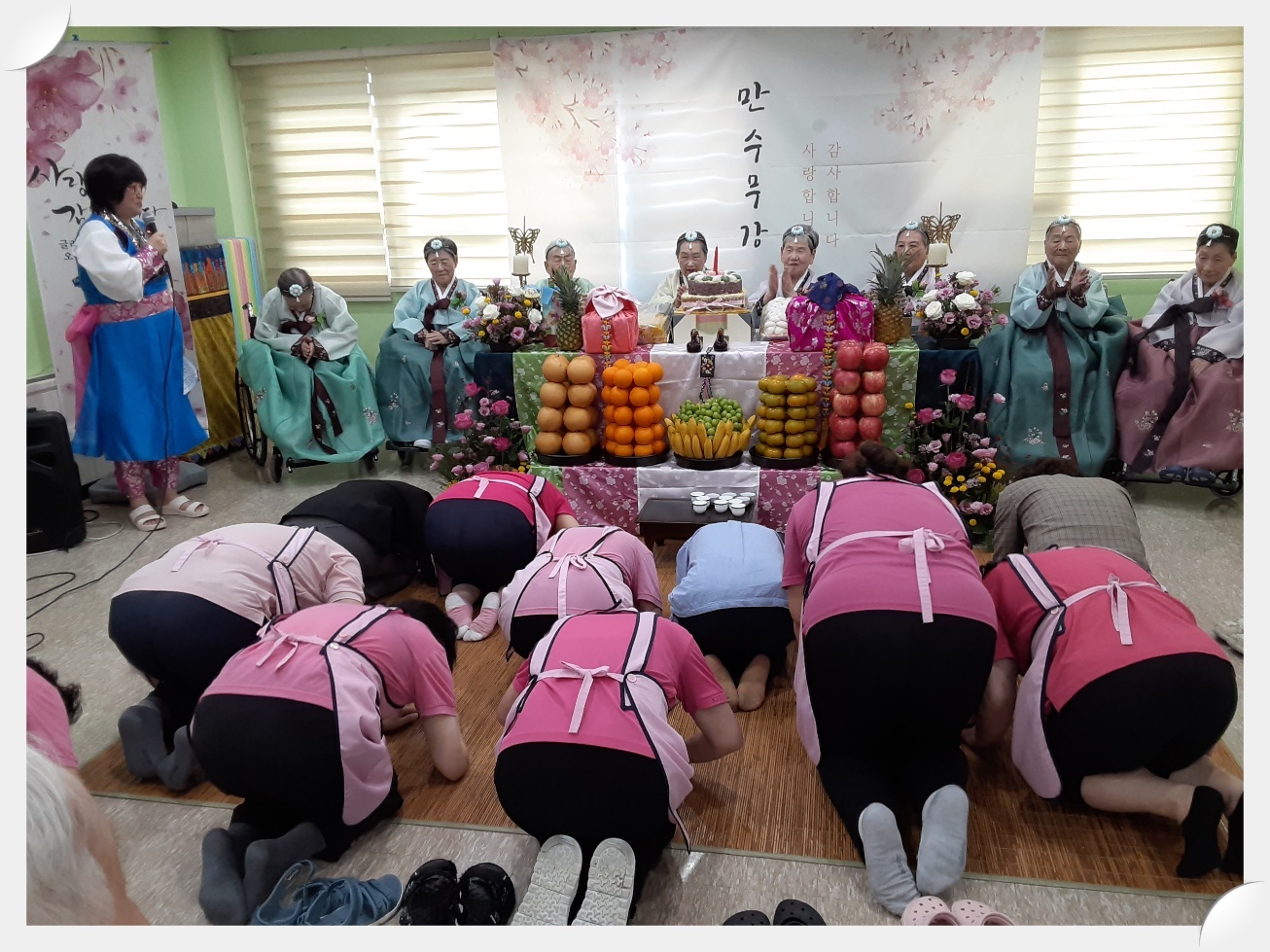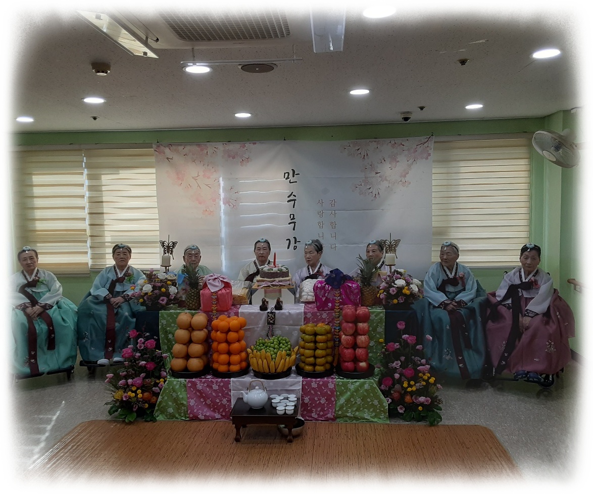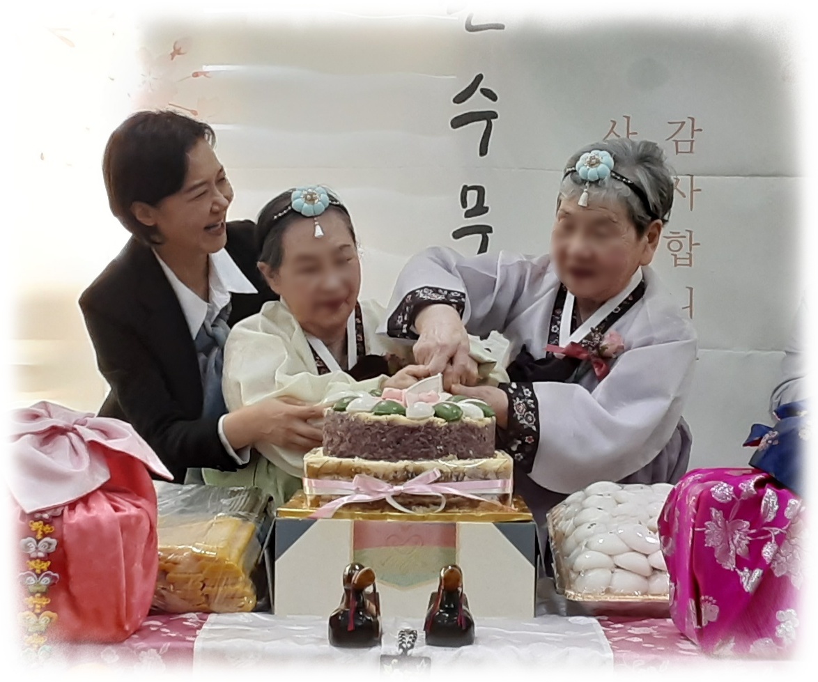 2024년도 팔순, 구순 대상자 어르신을 모시고 장수잔치를 해 드렸습니다. 준비하는 과정에 어르신들께서 관심을 많이 보이시고 기대감을 보이기도 하시며 즐거워 하는 모습을 보이기도 하셨습니다. 올해 장수잔지 대상자 어르신은 모두 9분으로 어느때 보다 풍성한 잔치였습니다. 2024년 장수잔치 개회사를 마치고 한 분 한 분 어르신들을 소개해 드리고 모두 큰 소리로 축하해 주셨고 원장님과 보호자 대표님 께서 인사말씀을 해 주셨습니다. 보호자 대표님께서 인사말씀을 하시며 이렇게 직접 와서 행사에 참여해 보니 너무 수고도 많으셨고 감동적이라고 하시며 감사의 인사를 전해주셨습니다. 인사말씀에 이어 원장님과 수녀님들, 보호자, 국장님과 종사자 의 헌주와 헌배가 있었고 떡 케익의 촛불도 끄며 어르신들이 건강하시길 기원드렸습니다. 보호자분들과 기념사진도 찍고 오랜만에 만나는 손주 손녀분들과 안부도 나누며 어르신들께서 매우 만족한 시간이었습니다. 2부행사에서 라르고 공연단의 공연도 관람하시고 보호자분들께서 어르신들 식사 도움도 드리며 오늘의 기쁨을 인지 않고 더 행복한 순간을 만들어 나가길 기원하는 시간이었습니다.